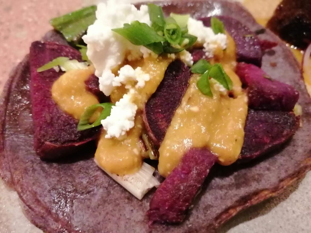 ブルーコーンで作られた、マットな紫色をしたトルティーヤの上に、塩味の効いた紫芋とクリームチーズ、九条ネギが乗り、その上からたっぷりのカシューナッツベースのサルサソースがかけられている。どの食材もバラバラではなく、1つのハーモニーを形成しており、カシューナッツのサルサソースが全体に濃厚なコクと香ばしさを与えている。