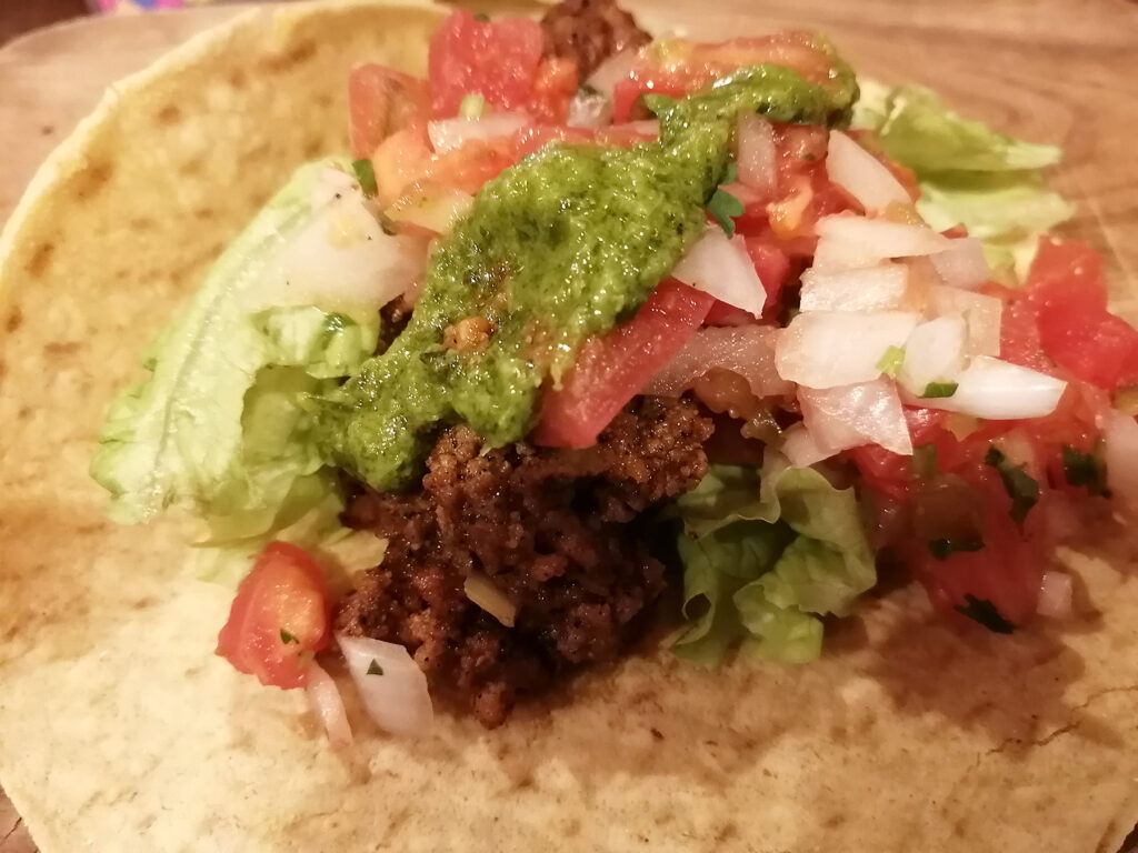 胡椒が効いた非常にきめ細かいひき肉と、トマト、玉ねぎ、レタスとの相性が非常によく、サルサベルデがそれらの味を引き立てている。他店によくあるタコライスの上に乗っているタコミートなる名前の肉とは異なり、非常に手の込んだ繊細な味付け。