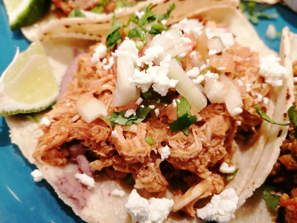 トルティーヤの上にフリホーレスが塗られており、その上にしっかりと煮込まれ味付けされたチキン、そしてその上に玉ねぎ、シラントロ(パクチー)、チーズが絶妙なバランスで配置され、味の完成度を高めている。フリホーレスとチキンの相性が素晴らしく良くて、食べた瞬間、これは美味しいと心の中で思わず出てしまう。そんなレベルのタコス。